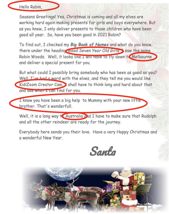 A personal message from Santa mentioning a special achievement from the year